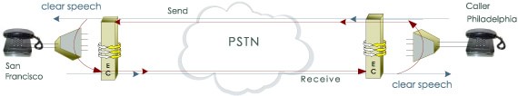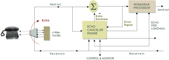 In order to combat the echo phenomenon, an echo canceller is employed. Today’s echo cancellers use sophisticated algorithms running on high speed Digital Signal Processors (DSPs) to combat the echo. By sampling the voice signal, the echo canceller can create a model of the echo path which is in turn used to estimate the echo. This estimation is then subtracted from the incoming voice signal allowing normal speech to pass through. This is a very simplistic view, as echo cancellers need to have the capability to sample multiple echoes occurring at different times and at different levels